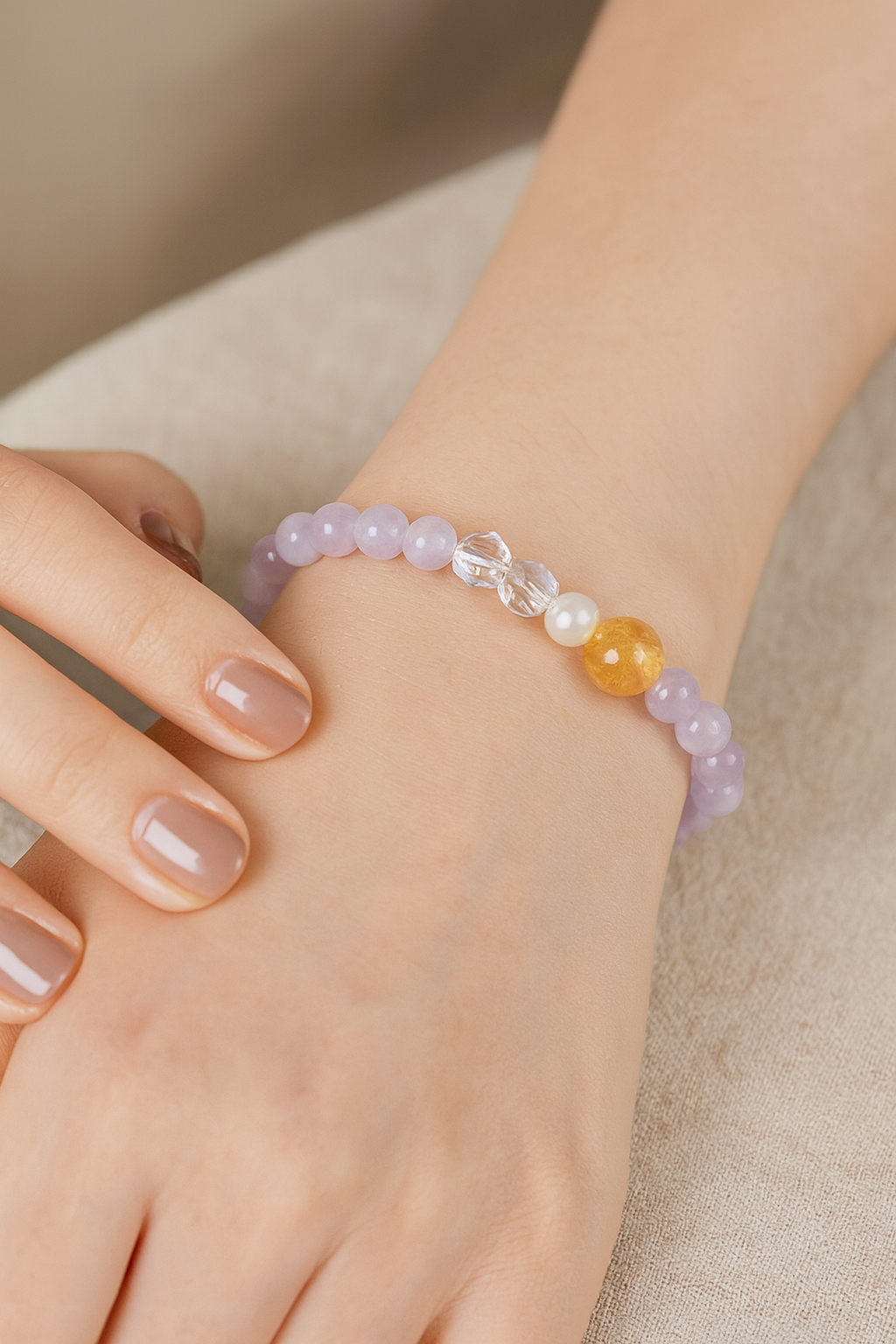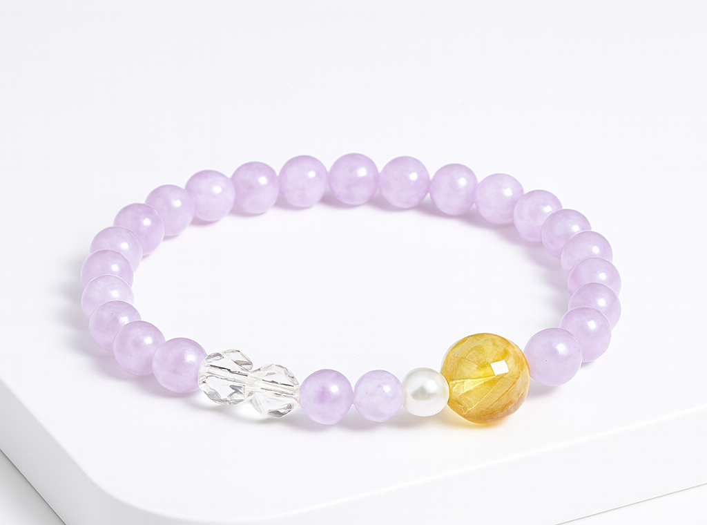 Embrace elegance and energy with the Radiant Harmony Bracelet, exquisitely crafted from Light Purple Chalcedony and adorned with a Golden Tower Crystal centerpiece. Designed especially for women whose Five Elements (Wu Xing) favor Fire, this bracelet helps to harmonize and amplify the wearer’s inner warmth and charisma.