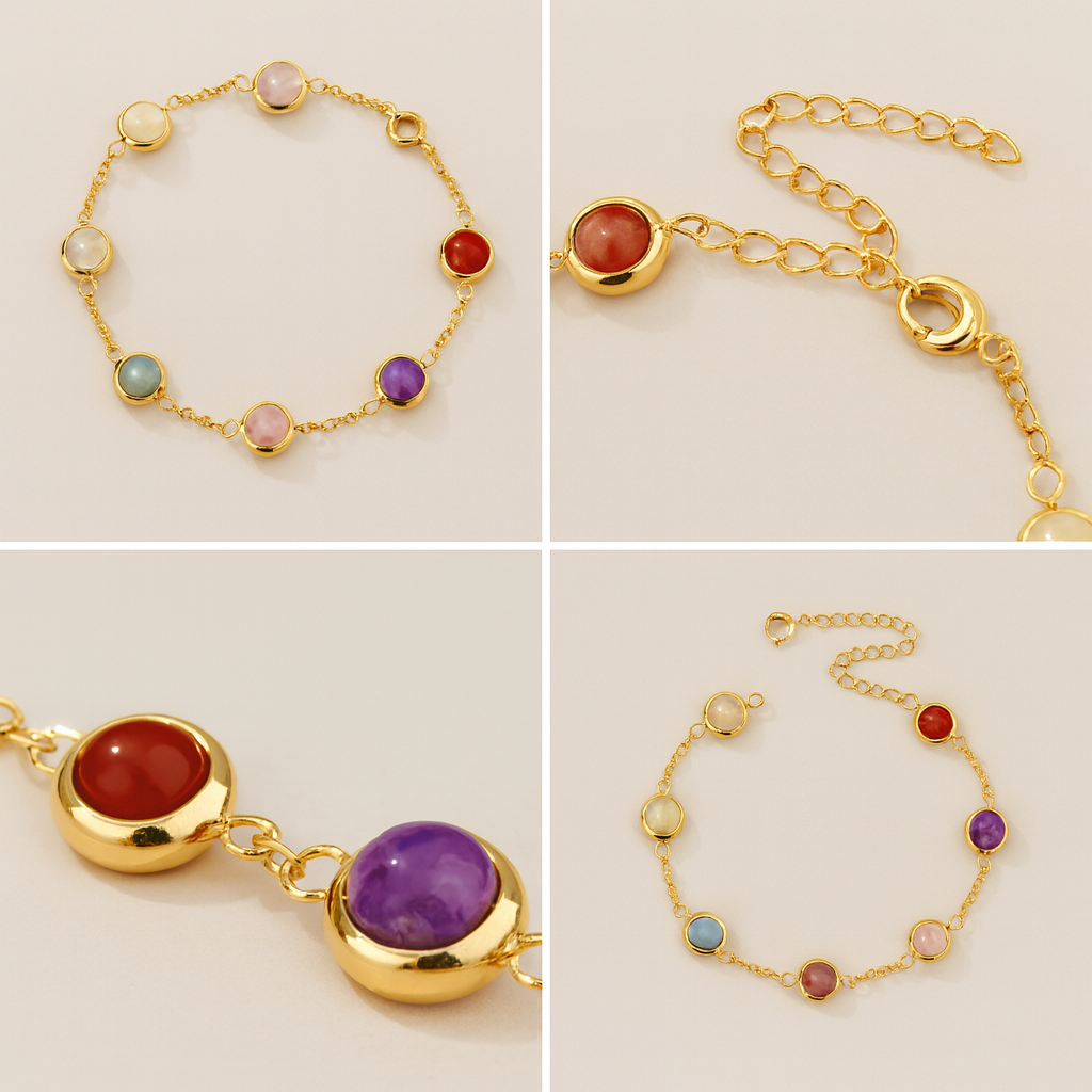 Crafted with 8 natural crystals, each representing a unique vibration of energy, this bracelet not only enhances your inner strength but also adds a touch of elegance to your everyday look. The smooth gold-plated links connect the crystals seamlessly, symbolizing unity, balance, and the endless flow of positive chi.