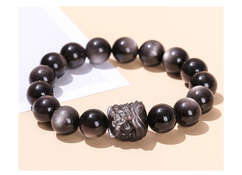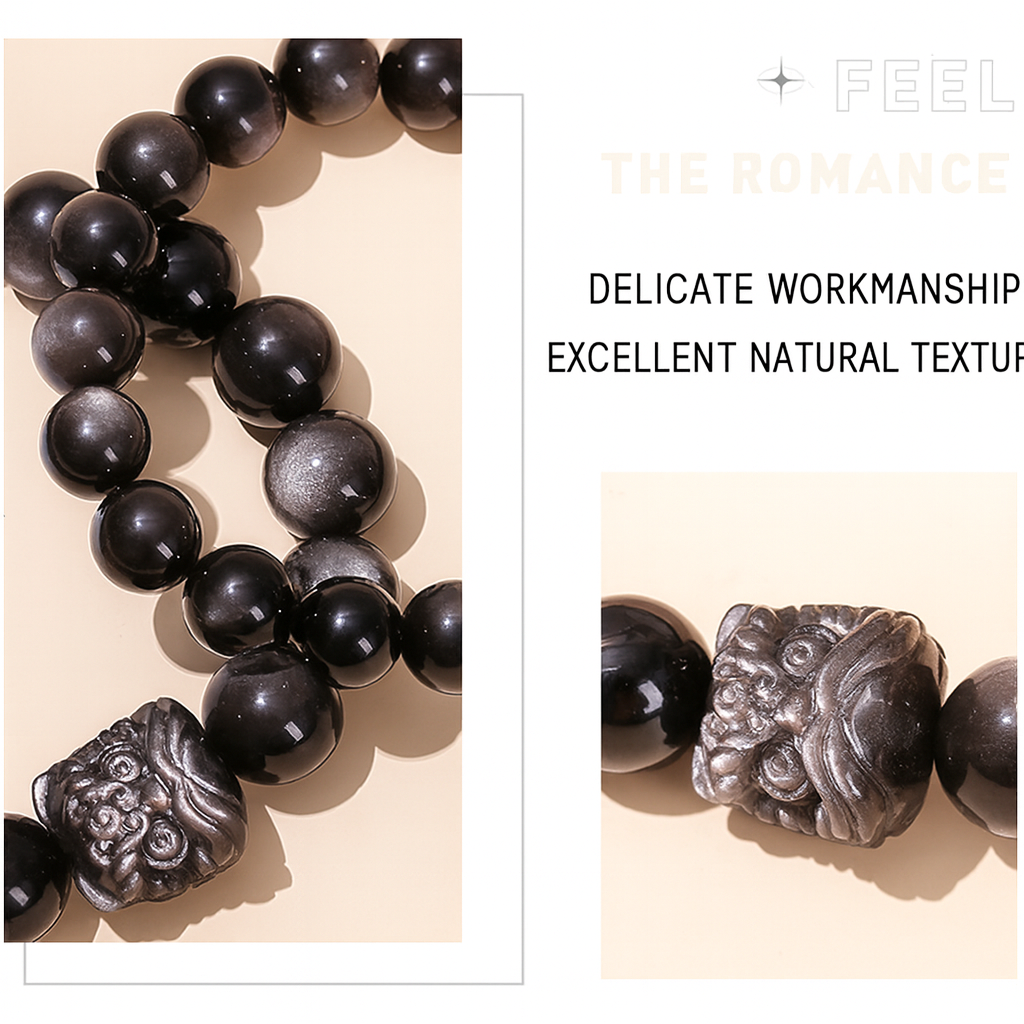 Each obsidian bead shimmers with silvery luster, symbolizing clarity and wisdom emerging from the depths of the soul. The centerpiece—a finely detailed Pixiu (awakening lion)—is a traditional emblem of prosperity, protection, and transformation, believed to attract wealth and ward off negative energy.